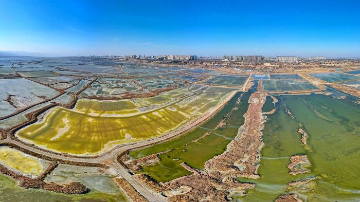 運城鹽湖是世界三大硫酸鈉型內(nèi)陸鹽湖之一,總面積約132平方公里,形狀宛如一條玉帶,蜿蜒在中條山下。鹽湖中的藻類和鹽水蟲繁殖,造成湖水變幻出各種顏色,七彩兼?zhèn)?,宛如一個巨型調(diào)色盤,各色顏料飽滿流溢、異彩紛呈。