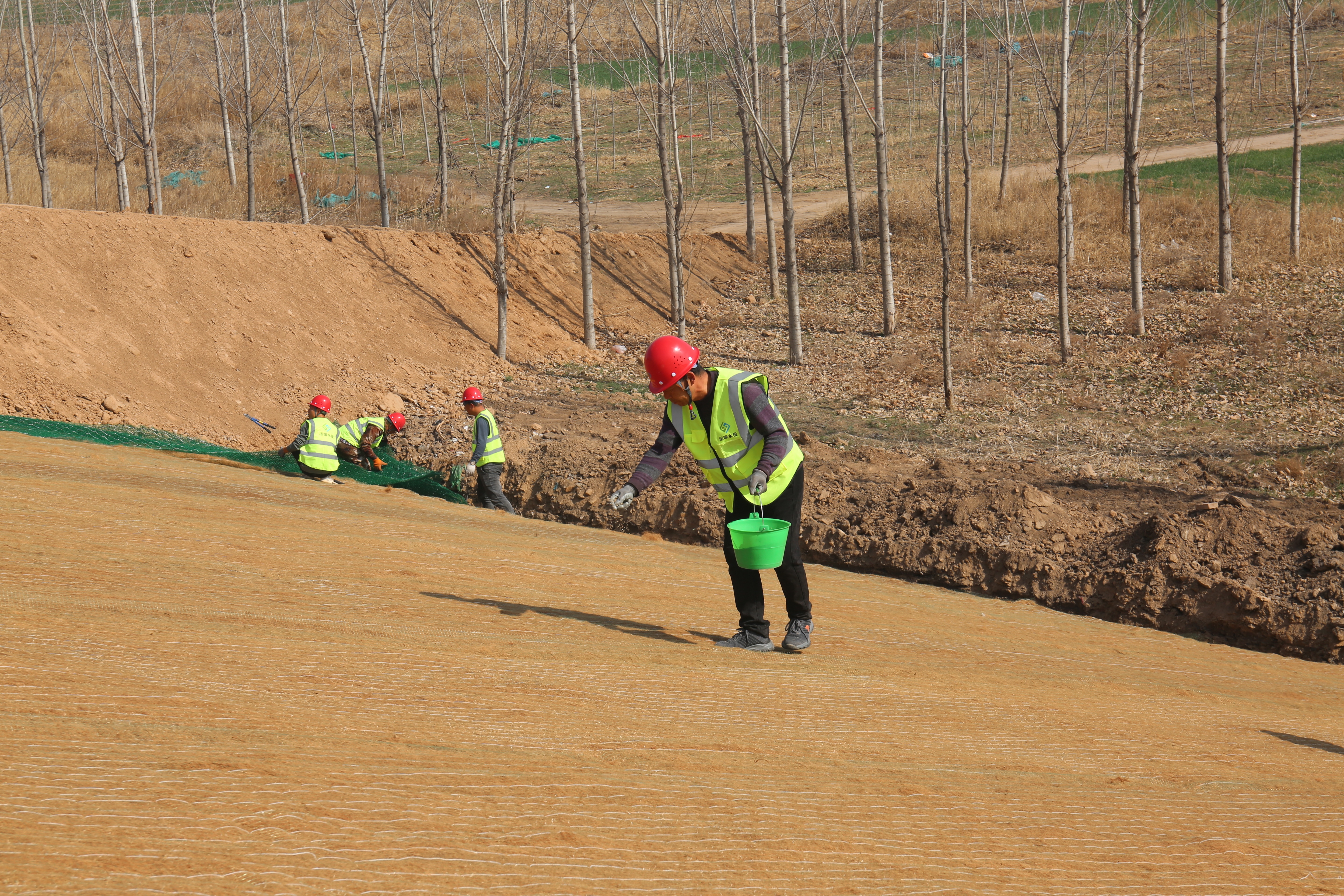 施工現(xiàn)場(chǎng),工程機(jī)械、運(yùn)輸車(chē)輛、施工人員正在加緊作業(yè)。一片片椰絲毯經(jīng)過(guò)清除坡面雜物、坡度整修、開(kāi)挖坑槽、播撒草籽等八道程序才能完好鋪設(shè)在大壩上。椰絲毯是一種新型環(huán)保材料,具有良好的吸水性、保濕性和透氣性,這種環(huán)保材料既可以起到穩(wěn)固河道邊坡、防止河岸沖刷破壞的作用,同時(shí)還能優(yōu)化生態(tài)環(huán)境。