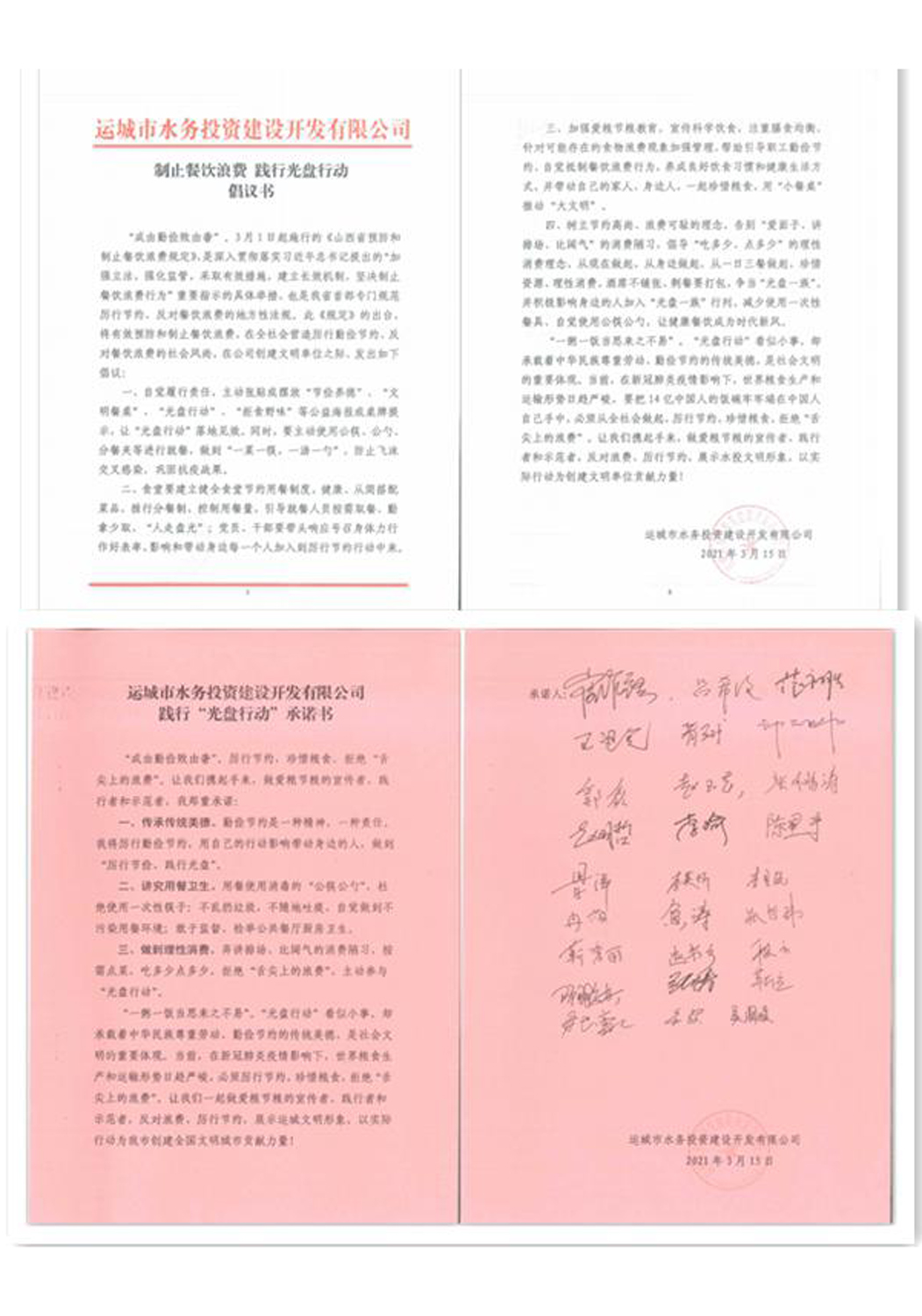 為響應(yīng)中央、省、市堅決制止餐飲浪費行為的號召,水投公司積極按文件要求,采取多種形式進(jìn)行宣傳落實。3月16日,公司以“制止餐飲浪費、踐行光盤行動”為主題,組織開展了系列活動,在公司及項目公司餐廳張貼公益海報,在公司大廳一樓大屏幕播放宣傳語。同時,在公司微信群發(fā)送了制止餐飲浪費、踐行光盤行動倡議書及承諾書,全體干部職工紛紛響應(yīng),簽署了《制止餐飲浪費、踐行光盤行動承諾書》。